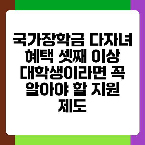셋째 아이를 키우는 부모님들은 자녀의 대학 진학을 앞두고 많은 고민을 하실 거예요. 등록금 부담이 만만치 않으니까요. 하지만 걱정하지 마세요! 셋째 이상 자녀에게는 국가에서 지원하는 다양한 장학금 제도가 있답니다. 이 글에서는 셋째 이상 자녀를 둔 대학생들이 꼭 알아야 할 국가장학금 다자녀 혜택에 대해 자세히 알려드릴게요. 꼼꼼하게 읽어보시고 놓치지 말고 혜택을 받으세요!